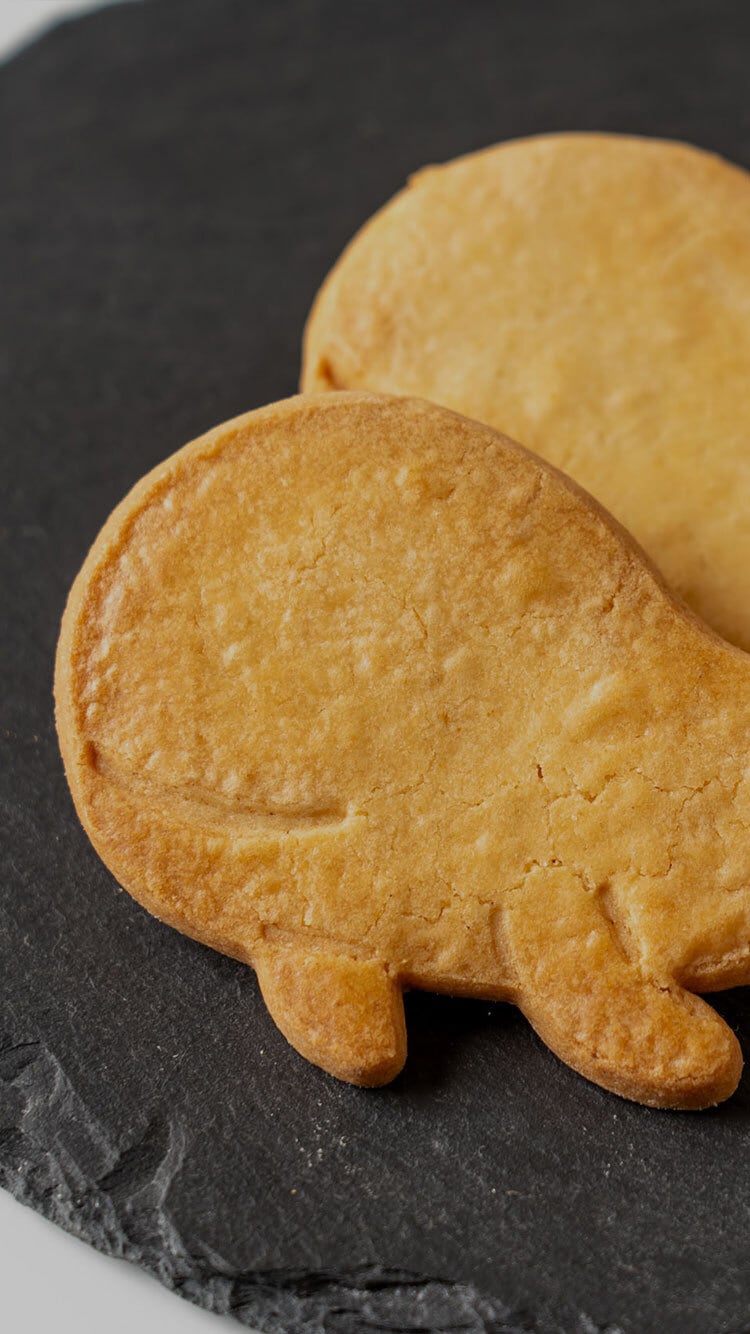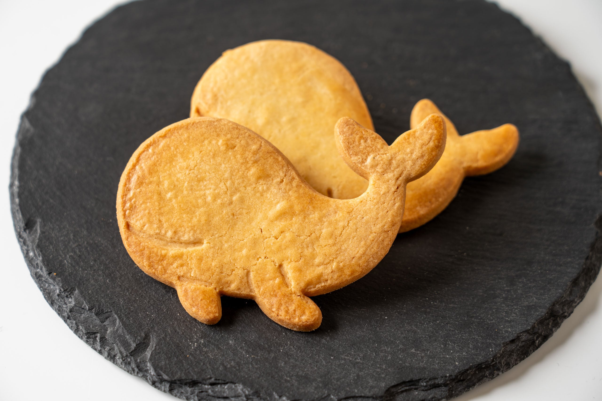 こんがりと焼き上げられた、にっこり笑顔のくじらサブレ。 さっくりとした歯ざわりの後に、ふわっと大きくバターの香りが広がります。 小麦の香ばしさを引き立てる甘みは、やさしくてほっこり。手作りならではの素朴さです。 おやつの時間に、ほっとひと息つけるような、テーブルを囲んでみんなが自然と笑顔になれるような、そんな焼き菓子をめざしました。